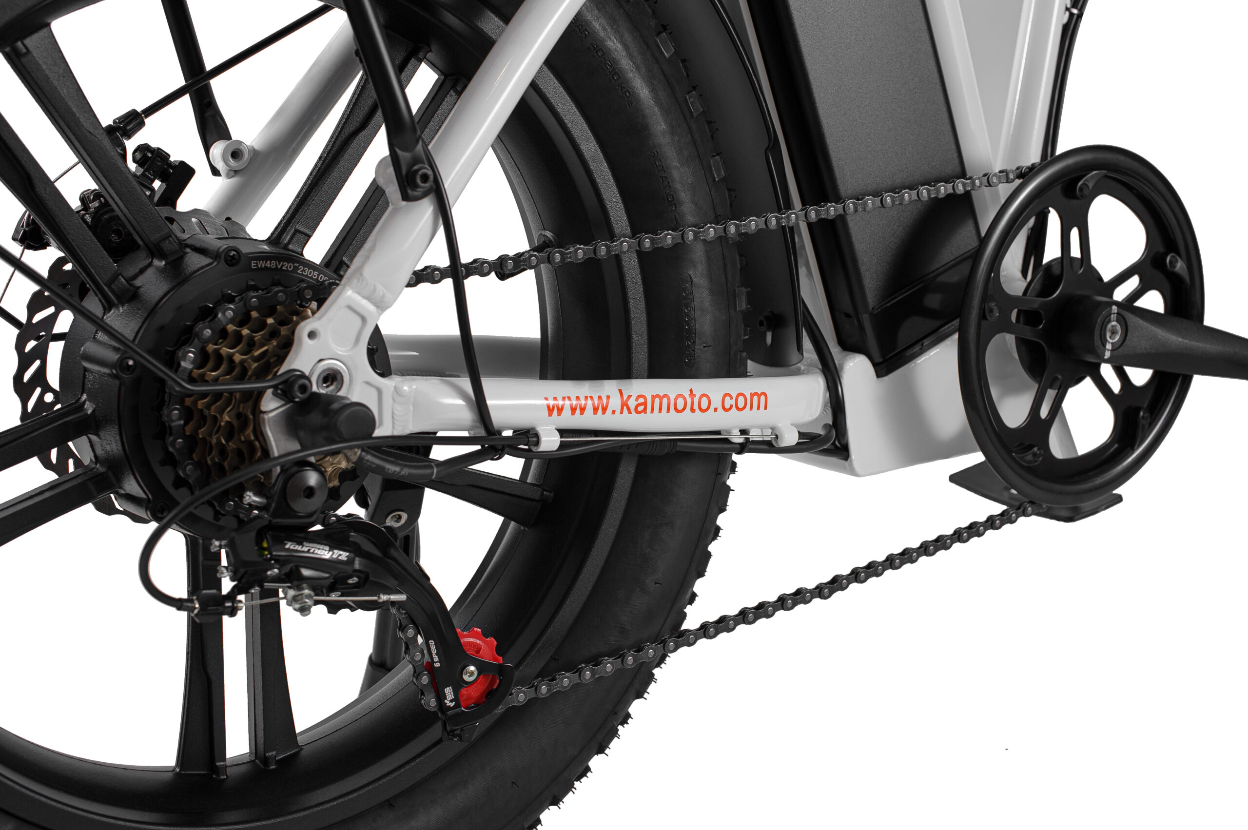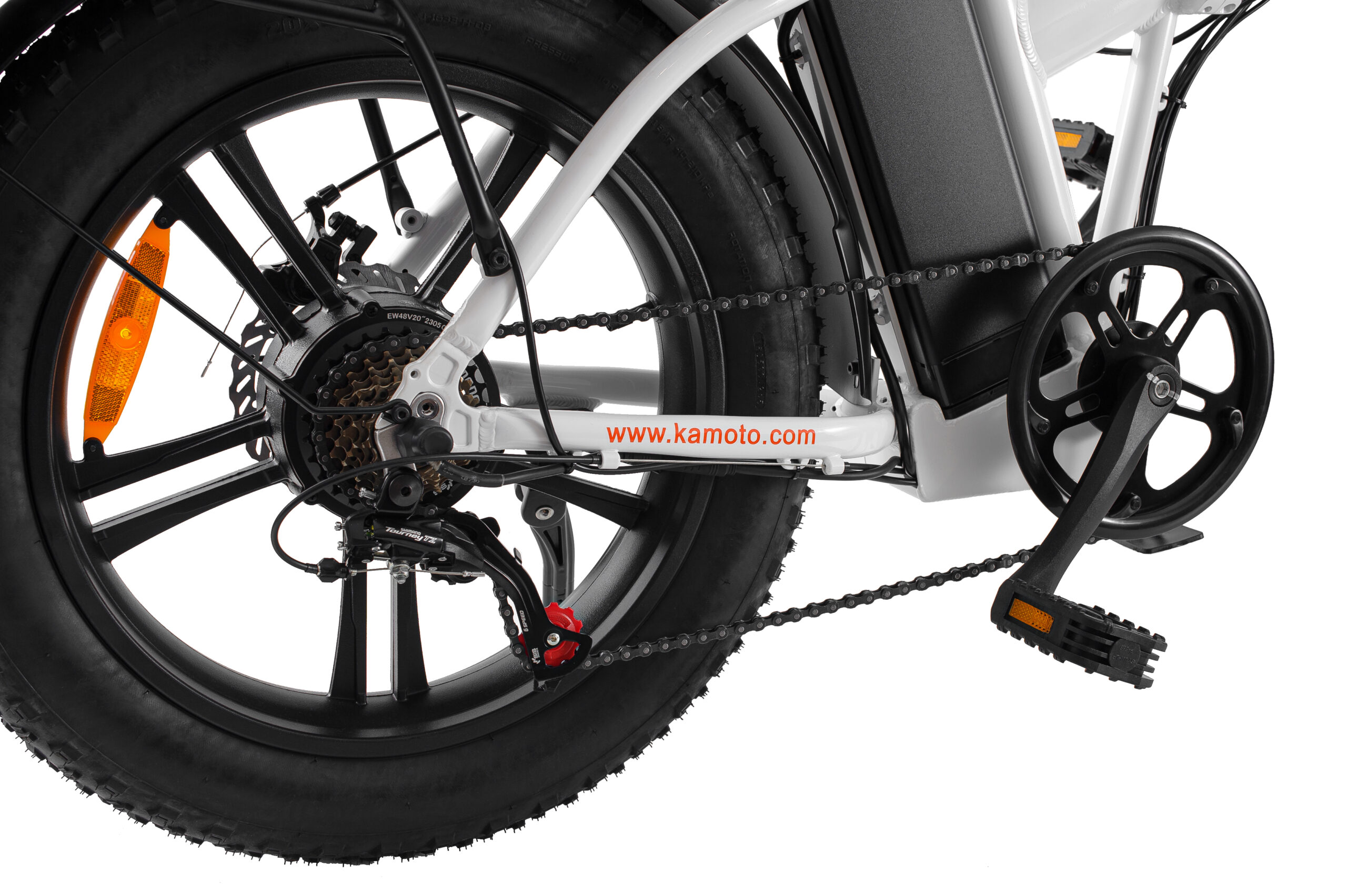 Kamoto GT4 предназначен для движения преимущественно на электроприводе, которому при желании можно помогать педалями, а можно ехать только на педалях. Редукторное мотор-колесо с максимальной мощностью 500 ватт, при этом не ухудшает накат. Оно развивает максимальную скорость до 25-27 км/час. Для электровелосипеда это прекрасный показатель! Сочетание электродвигателя с колёсами небольшого диаметра обеспечивает высокую тягу для заезда на крутые подъёмы.