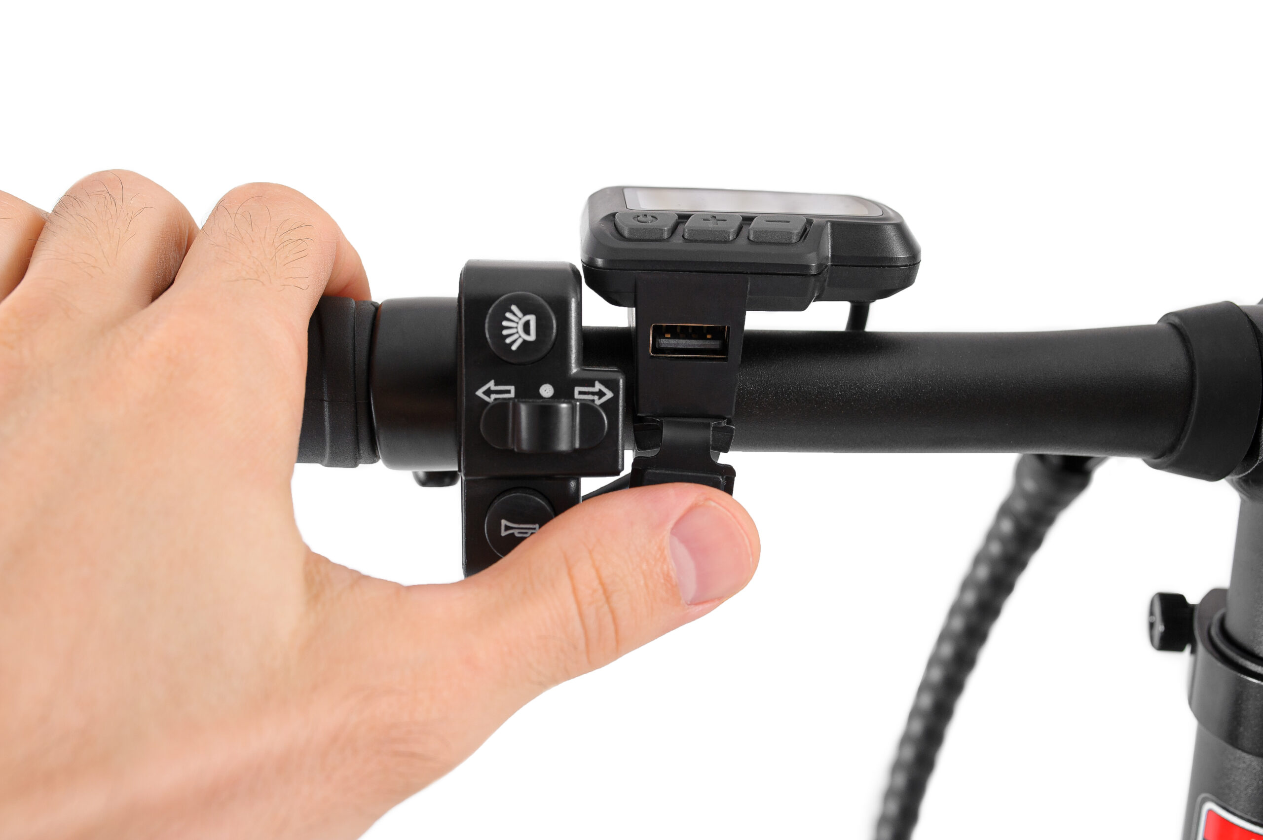 Ручка газа подключена к LCD дисплею с индикатором уровня заряда аккумулятора. Также имеется USB разъём, который служит для подзарядки гаджетов.