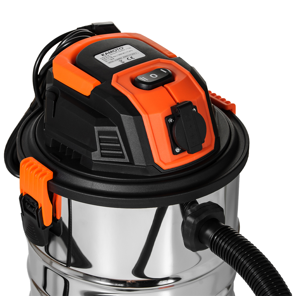 Пылесос Kamoto VC30 отлично справляется с опасной пылью. Применяется для сбора стружки, строительного мусора и жидкостей. Отличные характеристики всасывания обеспечивают машине высокую производительность. Контейнер пылесоса имеет оптимальный объем — 30 литров. В корпусе машины есть встроенная розетка для подключения электроинструмента мощностью до 2000 Вт., которая обеспечивает синхронность включения приборов. Поворотные колеса служат для мобильности перемещения. Встроенная функция выдувания позволит легко и быстро удалить застрявший мусор в шланге.