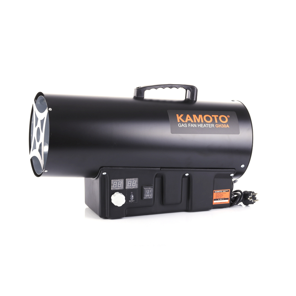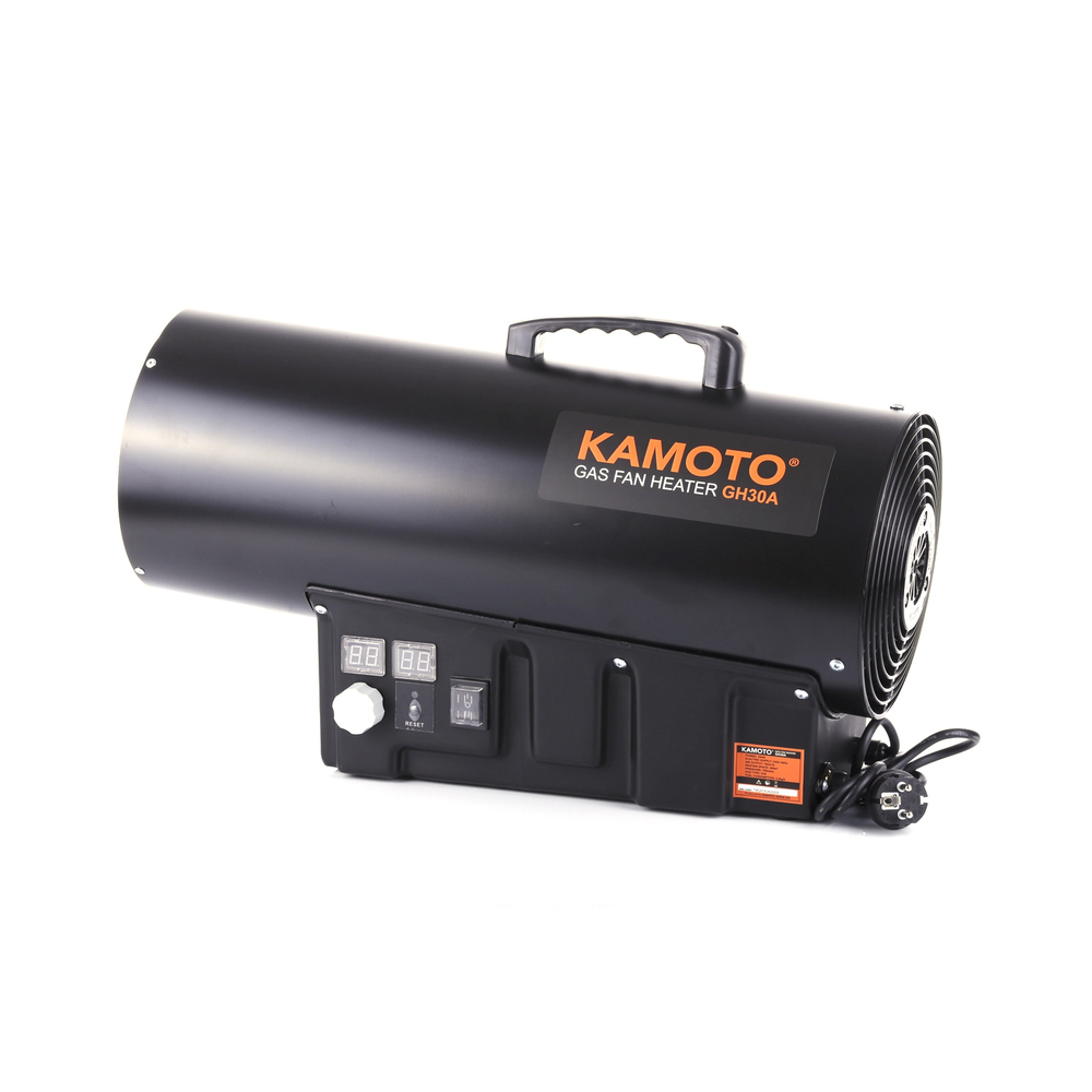 Переносная тепловая газовая пушка Kamoto GH30A на сжиженном газе пропан/бутан. Усовершенствованная горелка с увеличенной подачей кислорода увеличивает КПД и уменьшает выброс в атмосферу отработанных газов. Установлена система регулировки мощности, а также цифровой дисплей температуры (с помощью которого задаётся необходимая температура) и цифровой дисплей диагностики (указывающий реальную температуру в том или ином помещении), что позволяет максимально экономно использовать тепловую пушку и в больших и в минимальных по объему помещениях.
