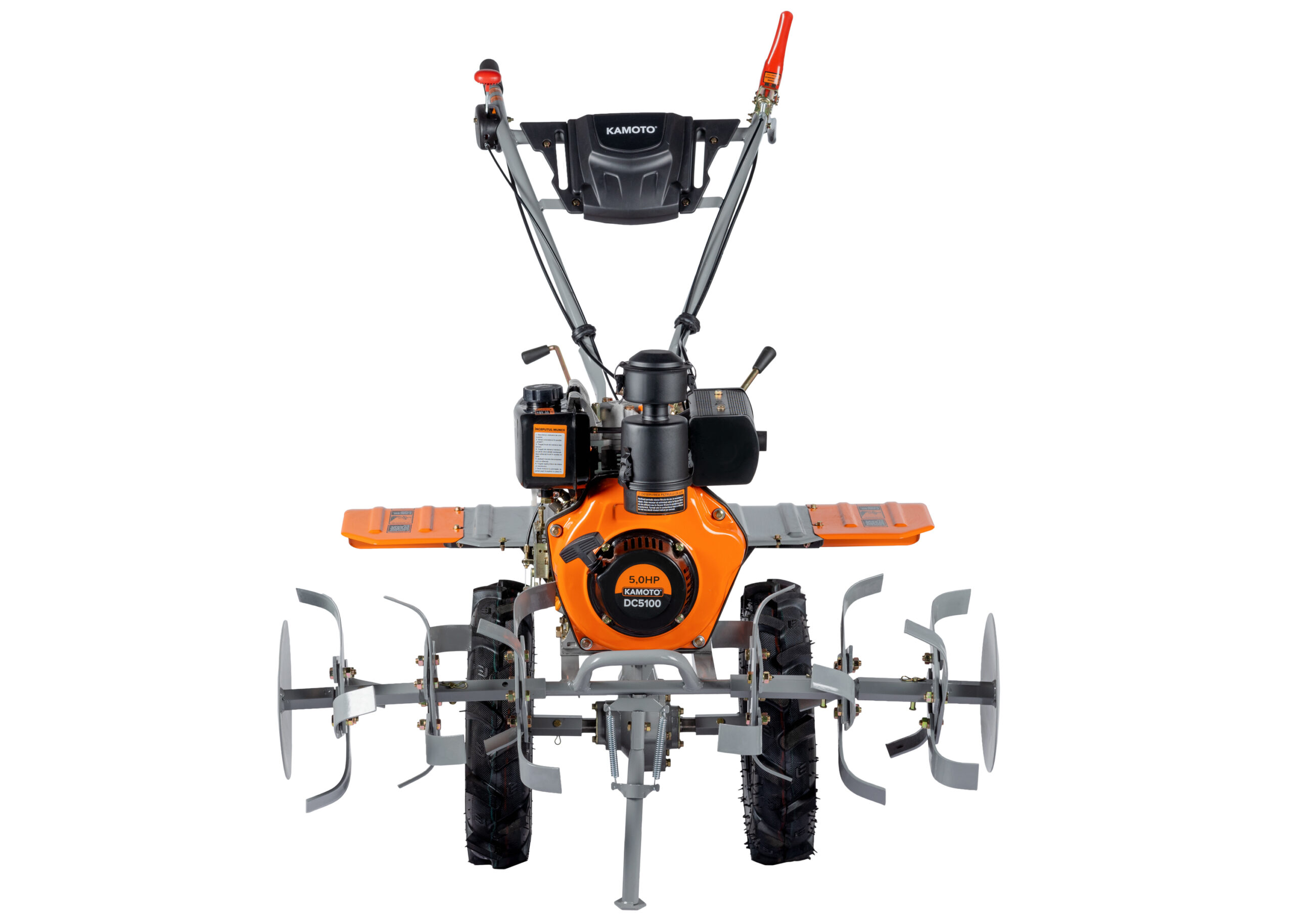 Мощный дизельный культиватор Kamoto DC5100 с двигателем мощностью 5 л.с. и с большой шириной захвата, укомплектован закаленными фрезами (24 шт), что позволяет применять его на тяжелых грунтах и для обработки целины.
