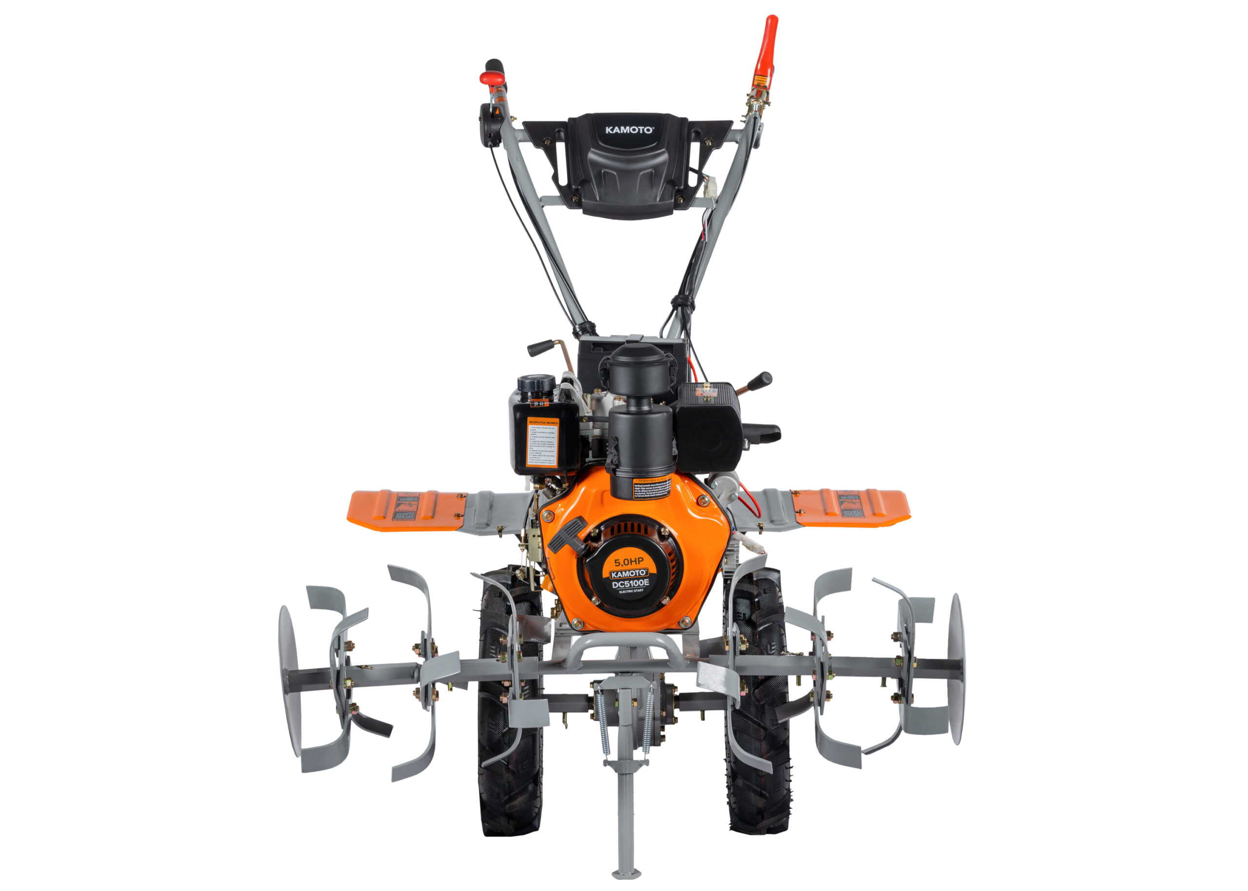 Мощный дизельный культиватор Kamoto DC5100E с двигателем мощностью 5 л.с. и с большой шириной захвата, укомплектован закаленными фрезами (24 шт), что позволяет применять его на тяжелых грунтах и для обработки целины.