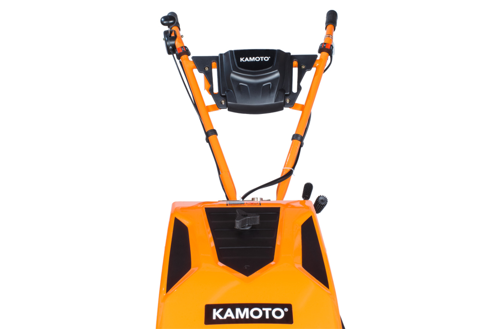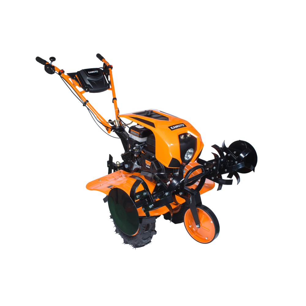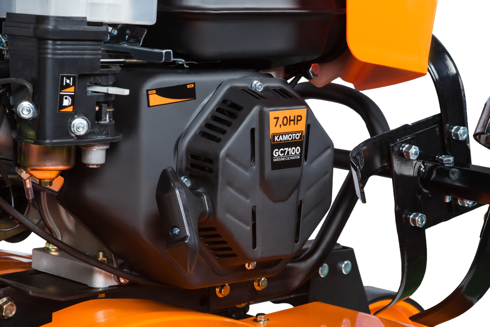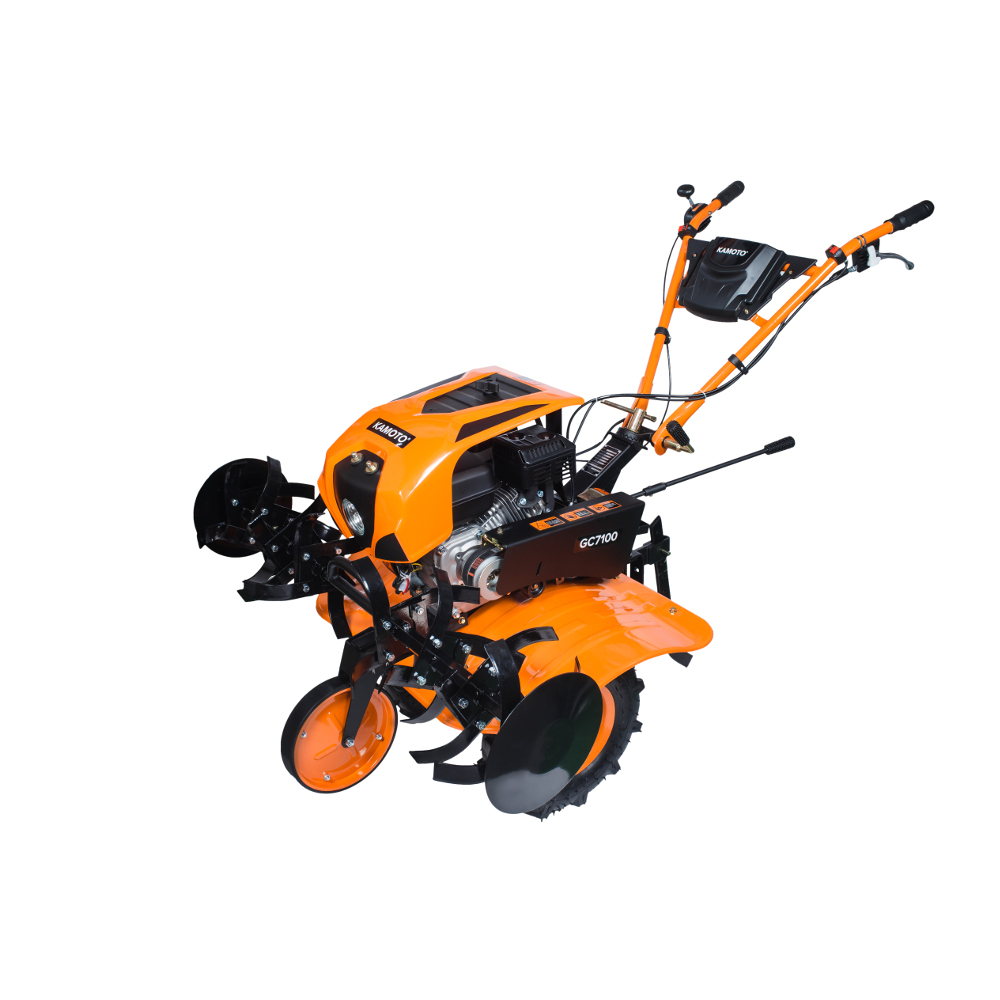 Мощный культиватор Kamoto GC 7100 с двигателем мощностью 7 л.с. и с большой шириной захвата (100 см), укомплектован закаленными фрезами (32 шт), что позволяет применять его на тяжелых грунтах и для обработки целины. Установлена рукоятка управления с возможностью регулировки и поворота в разных плоскостях, на которой также имеется отсек для хранения инструментов и различной мелочёвки. Переключение скоростей осуществляется через коробку передач. Установленный на культиватор мощный прицепной узел является самым распространенным и дает возможность устанавливать различное навесное оборудование: плуг, окучник, картофелевыкапыватель, а также подсоединить тележку. Также в комплект входят пневматические колеса и боковые диски.