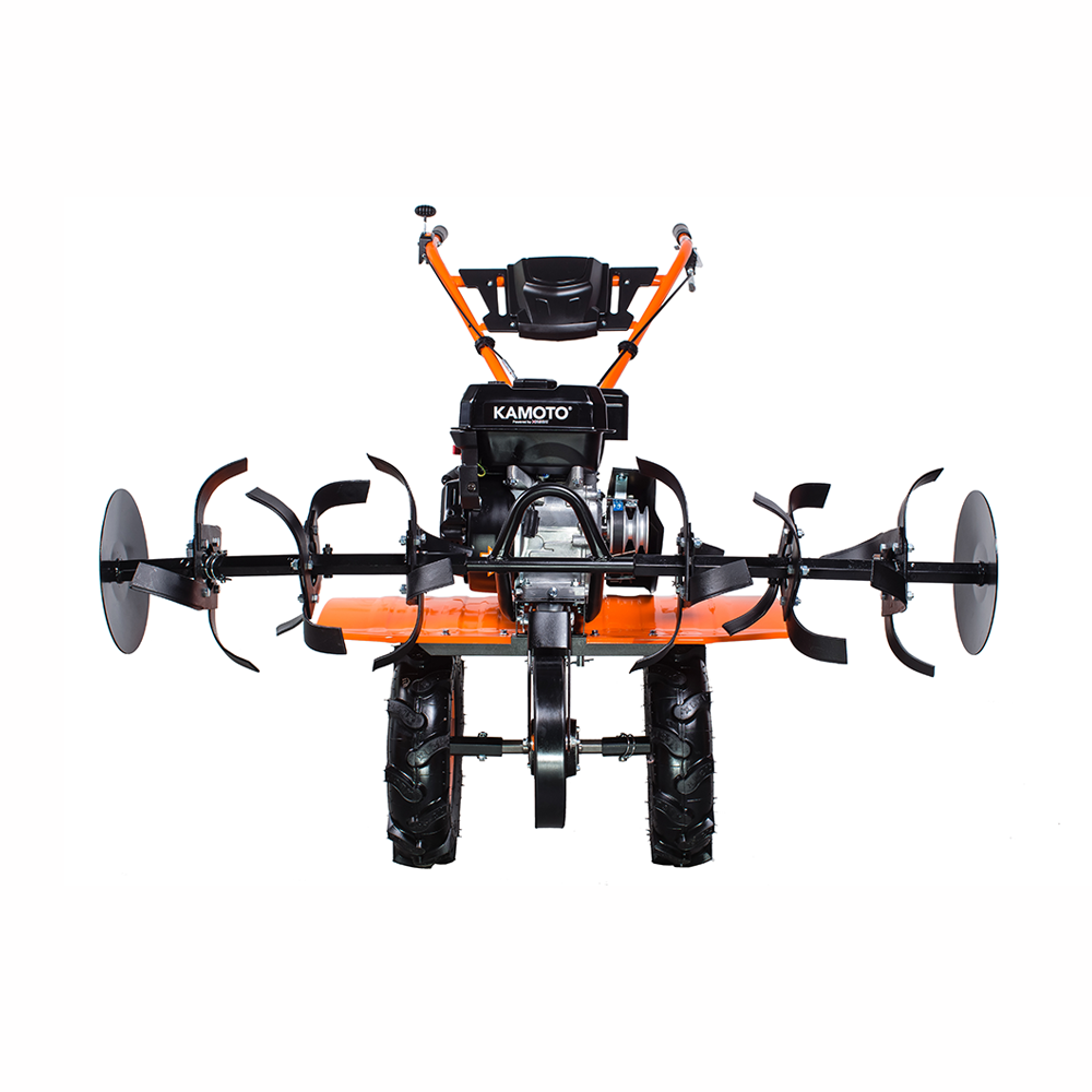 Мощный культиватор Kamoto GC7105 с двигателем мощностью 7 л.с. и с большой шириной захвата (105 см), укомплектован закаленными фрезами (24 шт), что позволяет применять его на тяжелых грунтах и для обработки целины. Установлена рукоятка управления с возможностью регулировки и поворота в разных плоскостях, на которой также имеется отсек для хранения инструментов и различной мелочёвки. Переключение скоростей осуществляется через коробку передач, а понижение или повышение передачи можно производить перекидыванием ремня с одной проточки шкива на другую: 4 вперед, 2 назад. Уже установленный на культиватор трехручейковый шкив дает возможность подключать роторную косилку и снегоуборщик, а мощный прицепной узел является самым распространенным и дает возможность устанавливать различное навесное оборудование: плуг, окучник, картофелевыкапыватель, а также подсоединить тележку. Также в комплект входят пневматические колеса и боковые диски.