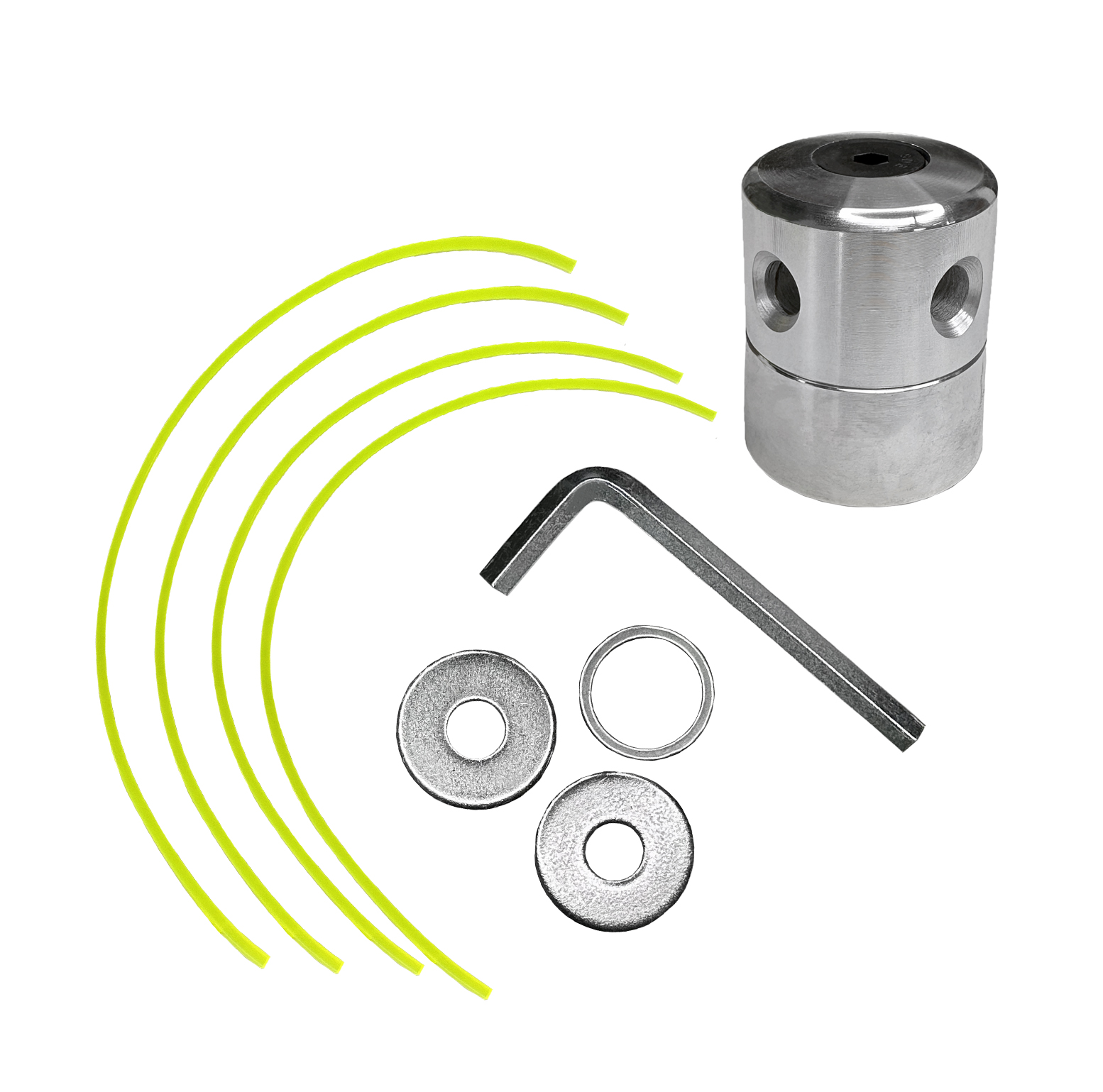 Универсальная катушка для триммера. Насадка для триммера подходит ко многим моделям с данной системой посадки. Триммерная головка имеет четыре выхода для лески. Замена лески у головки для триммера производится очень легко. Диаметр лески у триммерной катушки от 2,4 до 6 мм, вставляется в пазы кусками по 300 мм. В комплекте: насадка на триммер — 1 шт, шайбы — 2 шт, промежуточное металлическое кольцо, ключ — 1 шт + 4 отрезка лески. Подойдет вам, если ищете: триммерная леска для кошения травы триммером, нож для триммера, насадка катушка триммерная головка, дача, дом, уход за участком. Подходит для: аккумуляторный триммер электрический триммер бензиновый триммер
