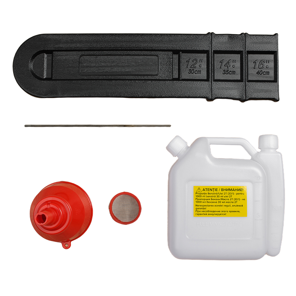 В комплекте поставки: емкость для смешивания топливной смеси, напильник для заточки цепи и необходимый для обслуживания набор инструмента.