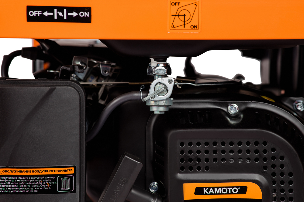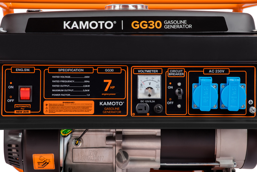 Оснащен системой ручного запуска, вольтметром, а выход на 12 вольт позволяет подзарядить автомобильный аккумулятор в экстренном случае.