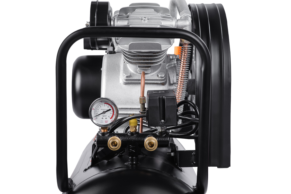 Двухцилиндровый масляный компрессор AC30100 с ременной передачей, увеличенной производительности, применяется для сервисных, ремонтных работ в гараже, на шиномонтаже и автосервисе.